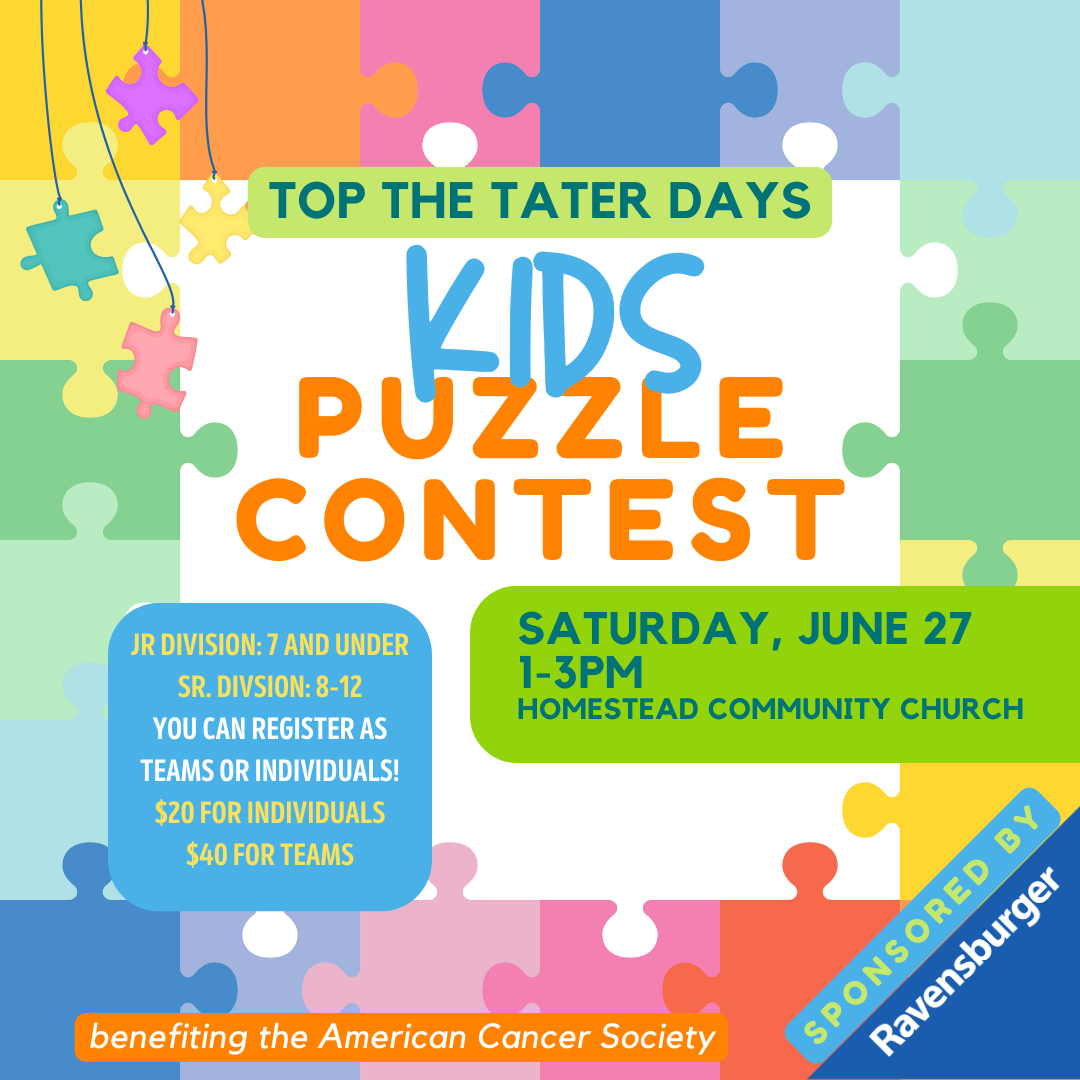 This year, we are bringing a kids puzzle contest to the Top The Tater Days fun. Speed puzzling has become hugely popular, even among kids and we are excited to include them this year. The Puzzle Contest is a fundraiser for the American Cancer Society - Relay For Life of Farmington, MN. Proceeds will go toward cancer research, prevention and patient support. There will be an 8-12 group and a 7 and under group. Each group will have the option of solo or pairs. ( Pairs teams can consist of any age 12 and under. Just pick the oldest age when registering). The puzzle will be 100 pieces and there will be 2 hours to complete the puzzle. The tables will be 6' round tables. Top 2 teams from each of the 4 groups will receive a prize. 1 adult MUST stay with each group. There will be chairs along the wall for the adult to watch from.