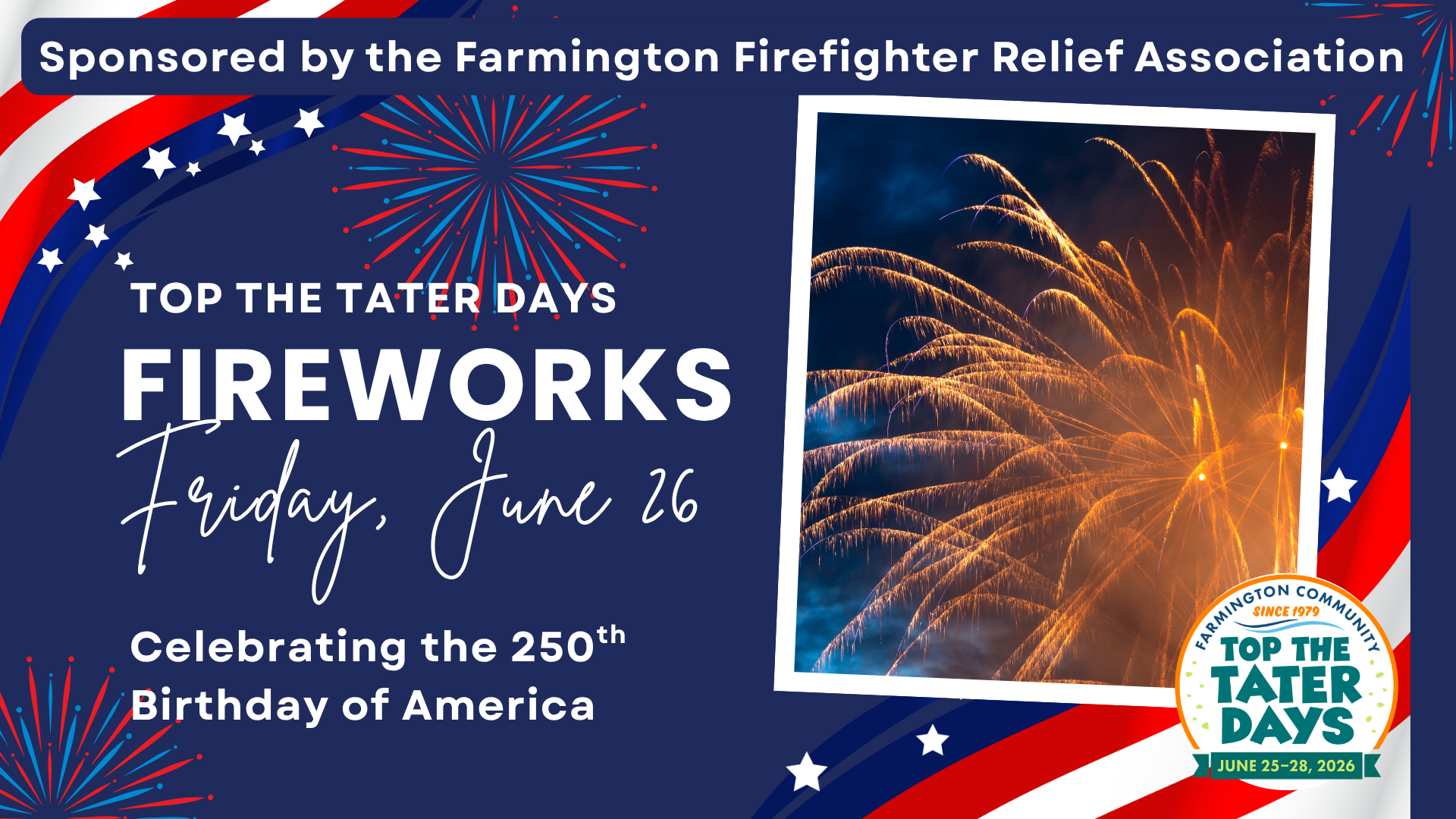 We are so excited to add fireworks to Top the Tater Days 2026! In celebration of the 250th Birthday of America, Top the Tater Days will be wrapping up our Friday Night Patriotic Block Party with a fireworks display right in downtown Farmington!