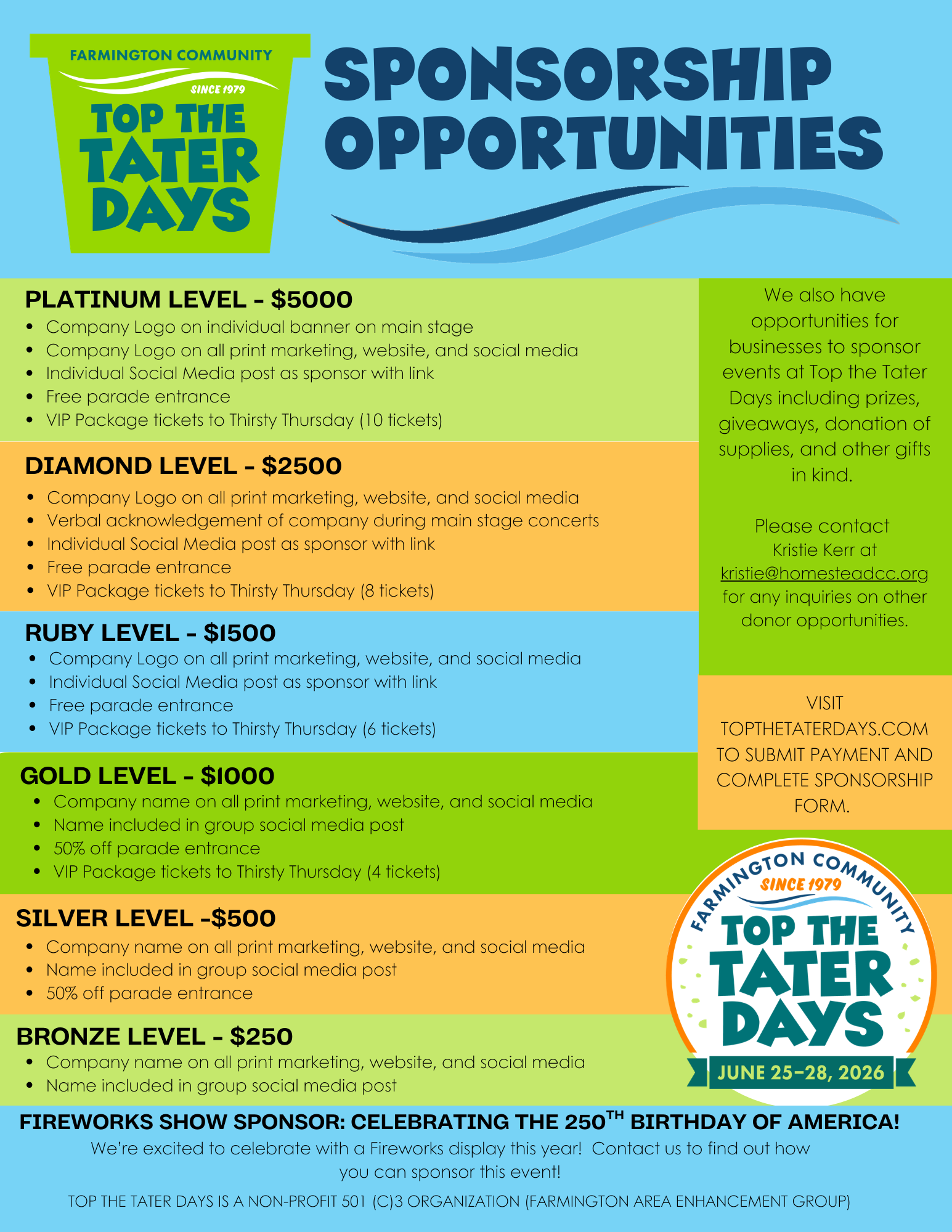 Would you consider a sponsorship for 2026 Top the Tater Days? Not only will you provide foundational support for this community event, but we also will provide exposure for your business and organization as a key supporter of Farmington. It’s a win/win!